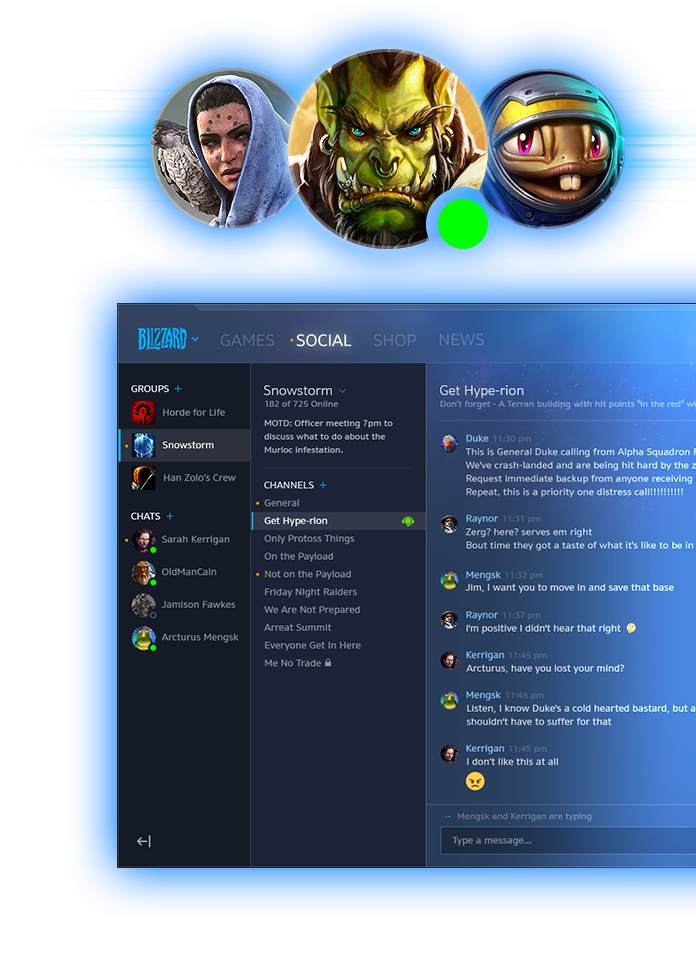 Blizzard Groups give you a home on Battle.net to connect with friends and other players. They make it easy to discuss strategies, set up play time, or just hang out and chat.